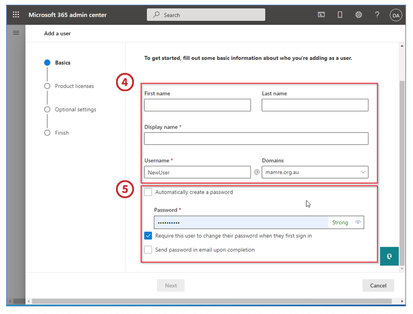 You will be brought to Add a user -> Basics.