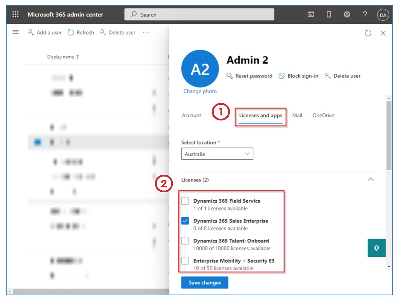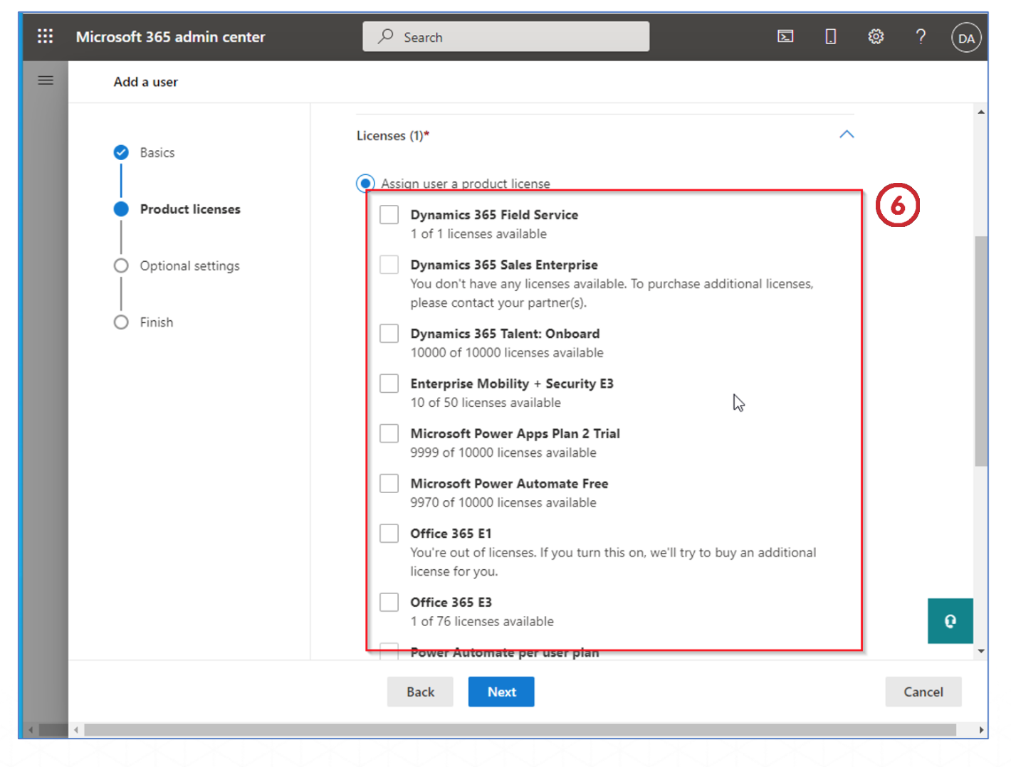 - Assign product licenses depending upon the role of the user by selecting the checkboxes next to the option. (e.g. Dynamics 365 Field Service)