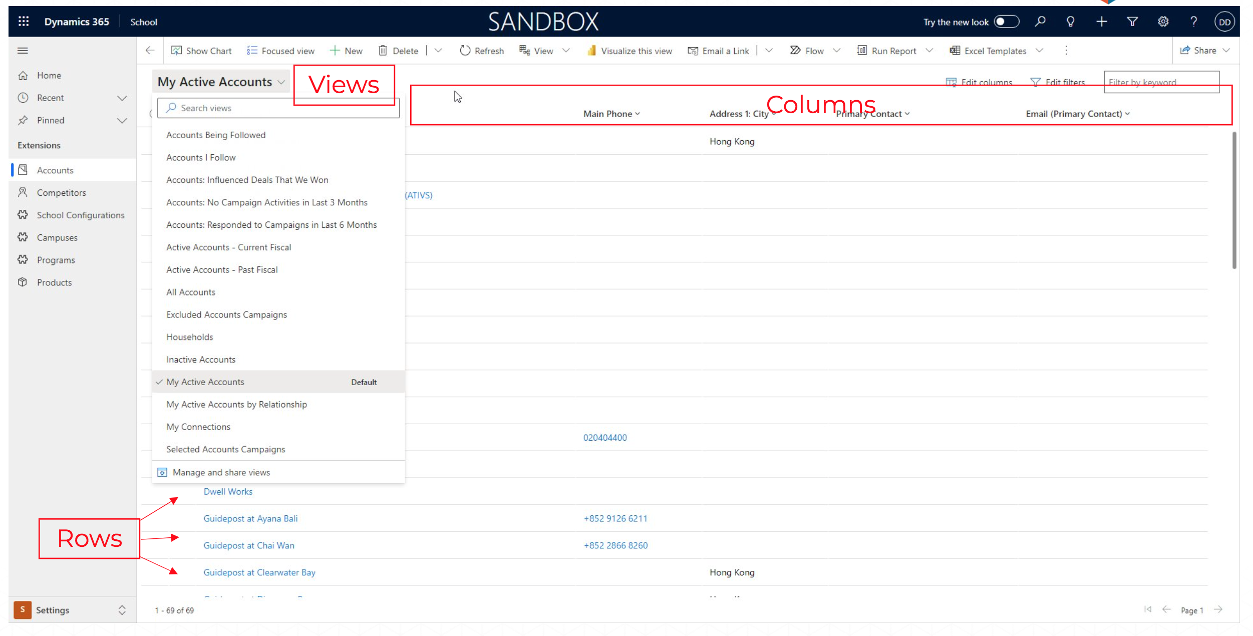 Views display the information. You can also search or query for specific information you want using Search views. A view is a dynamic list of rows from a single table. It’s essentially a pre-configured query that presents a subset of data based on specific criteria. Views allow users to see relevant data without having to search or filter every time. For example, a “My Active Contacts” view might show only the contacts assigned to the current user and whose status is “Active.” Views can be shared and are crucial for providing a tailored user experience.