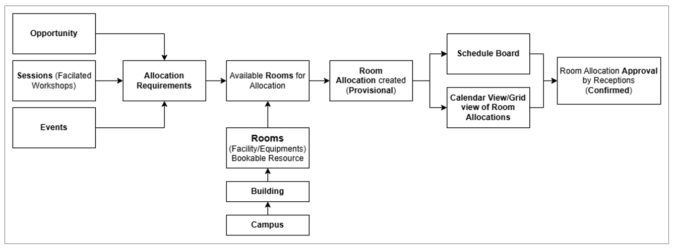 Room allocations for Events are managed directly through the Event record. When an event is created, based on the event details (date, time, capacity), the system automatically generates an Allocation Requirement for room matching and scheduling.