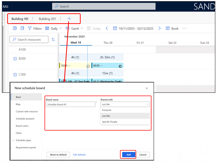 The Board Tabs allow users to create and switch between multiple schedule board views. Each board can have its own filters, layouts, and room groups, making it easier to manage different campuses/buildings, or types of rooms.