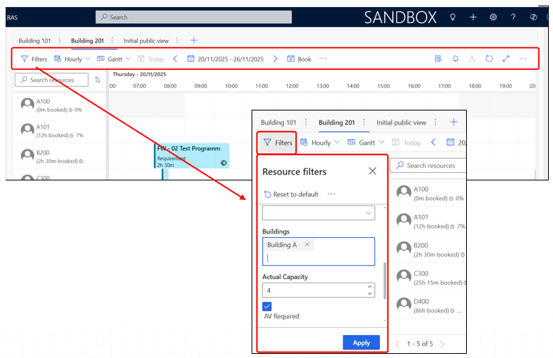 - Filters: Apply filters to show only specific rooms/resources (e.g., by capacity, campus, building, etc).