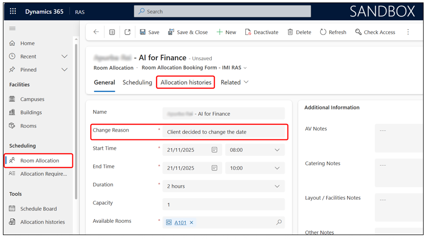 Allocation History provides a full audit log of every change made to a Room Allocation record. It helps track what changed, who changed it, when it was changed, and why the change was necessary.