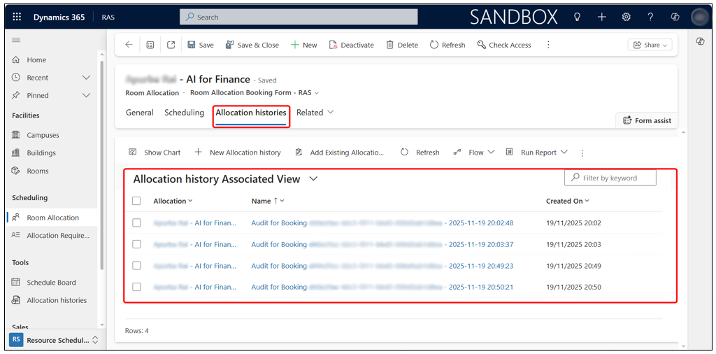 Open the Room Allocation record and go to the Allocation histories tab. Here you will see a list of all history entries recorded for that booking. Each entry provides detailed information about the update.