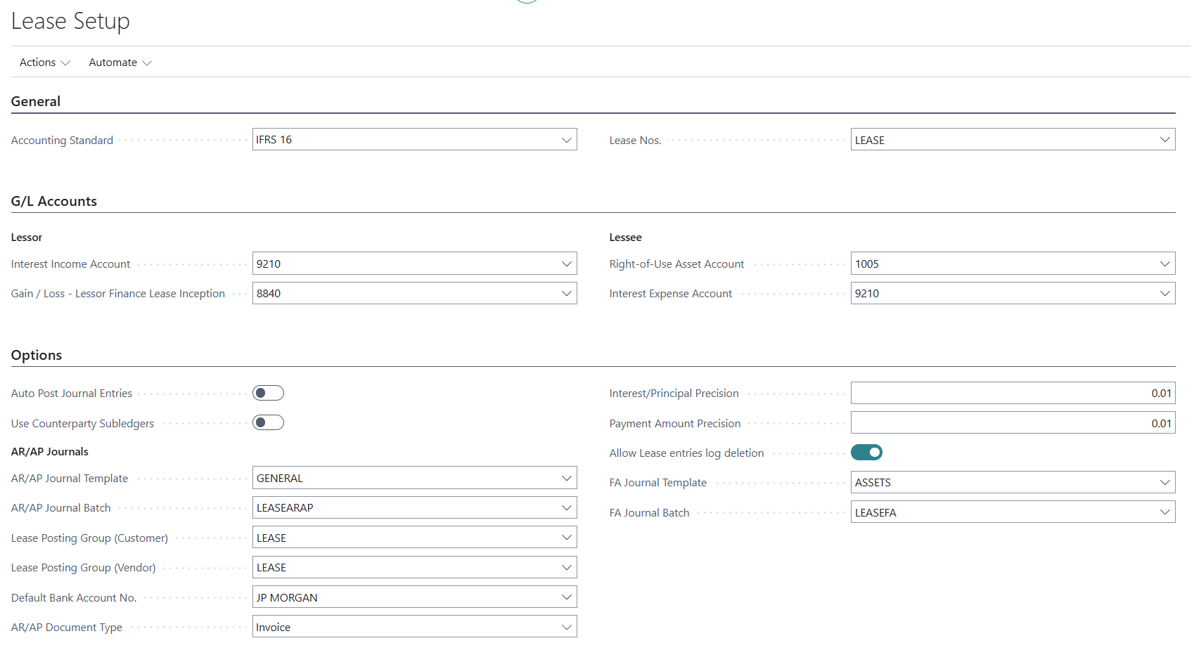 - FA Journal Template – select the default journal template to use for generated lease entries