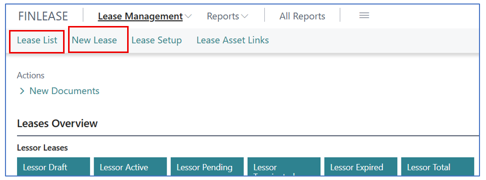 Each lease (contract) will be associated with a Lease Card. To create a new lease card, select [Lease Management] > [New Lease], or search for Lease List.