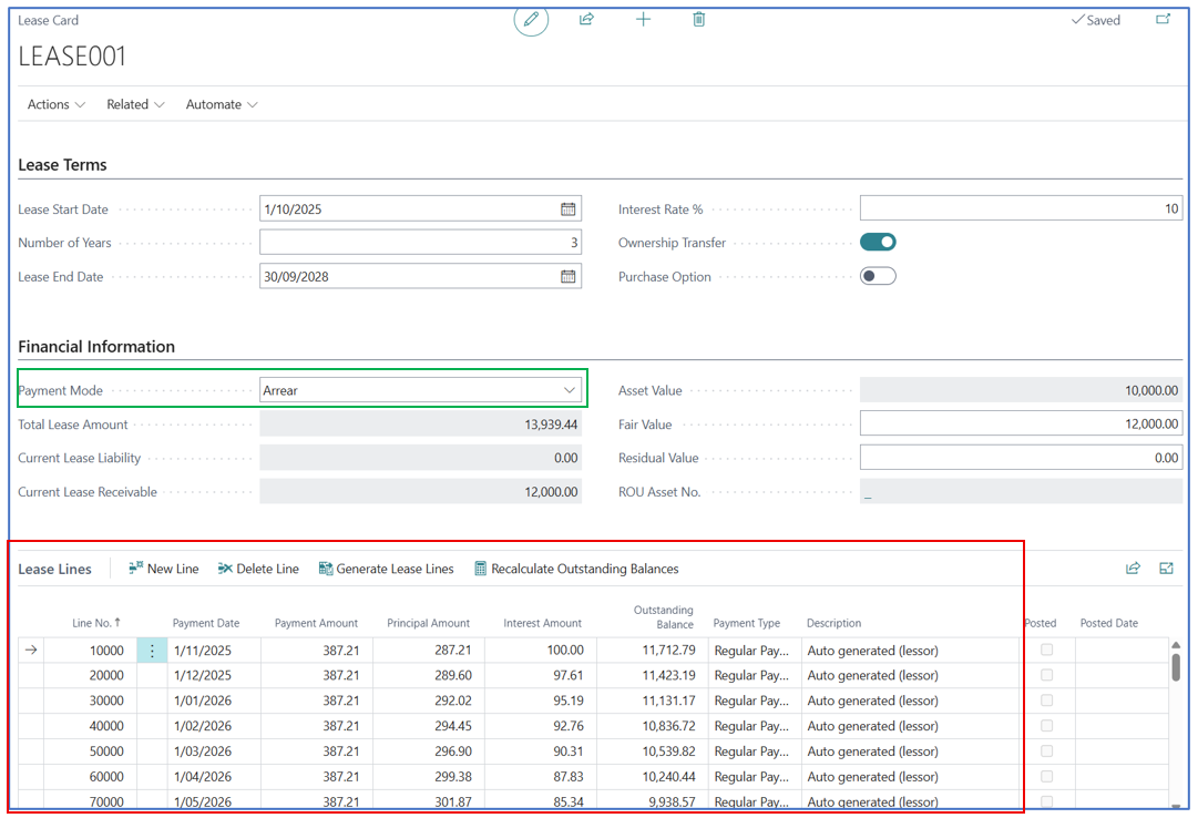 The Lease Lines FastTab section provides the monthly lease payment amortisations and interest expense per period for the entire lease term, according to the Payment Mode.