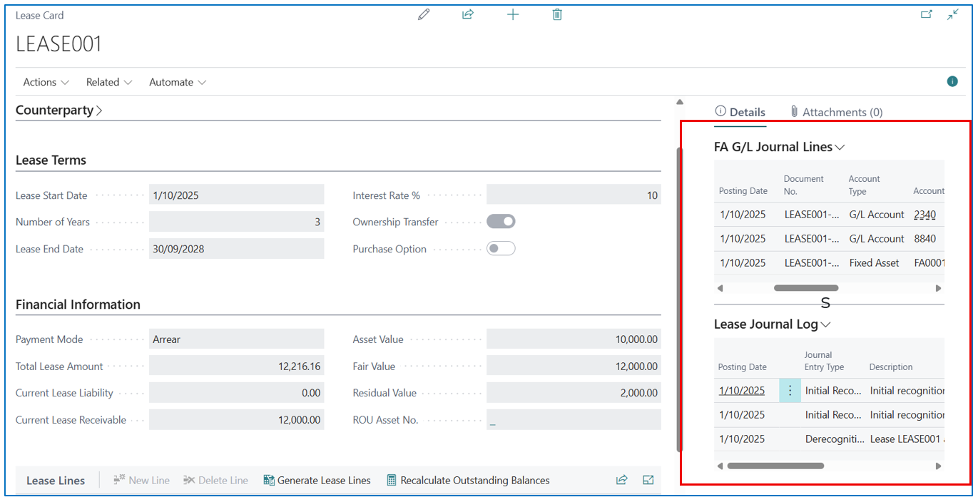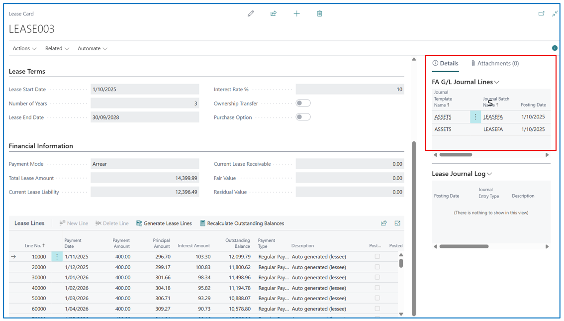 The journal entries (and Journal Log entries) can also be viewed in the FactBox from the Lease Card.