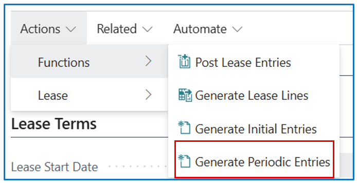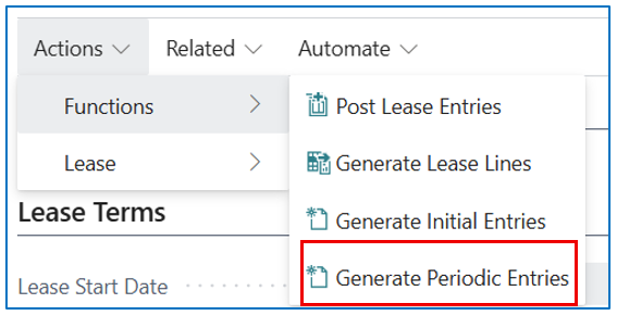 Once the lease details are confirmed on the lease card, select [Actions] > [Functions] > [Generate Lease Lines] to compute the monthly amortisation based on the interest rate %, the Start and End Dates of the least, and the asset value.