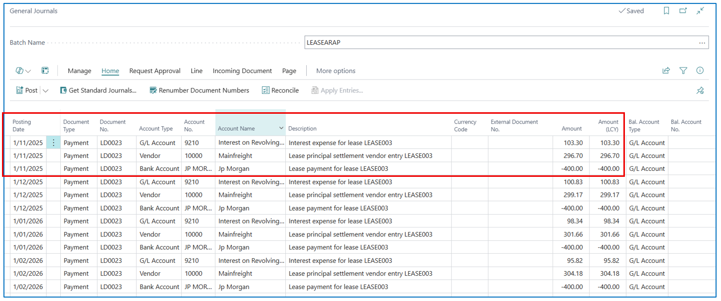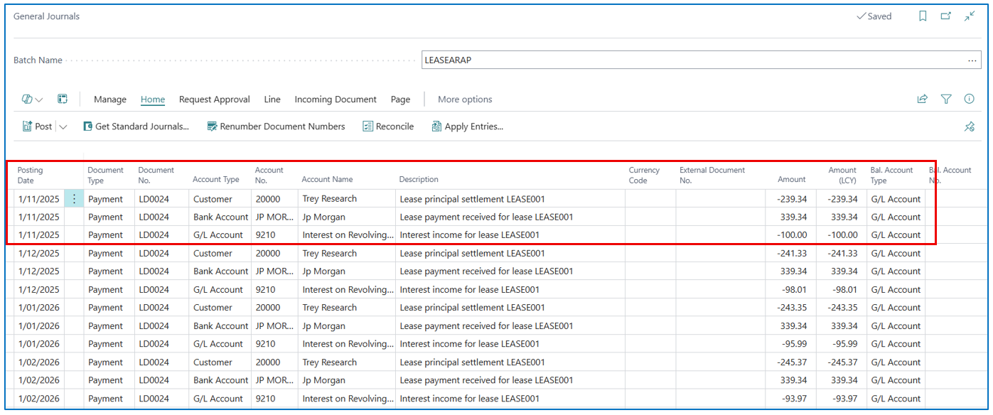 Posting date for the entry will be the Lease Start Date. The journal line description references the Lease No.
