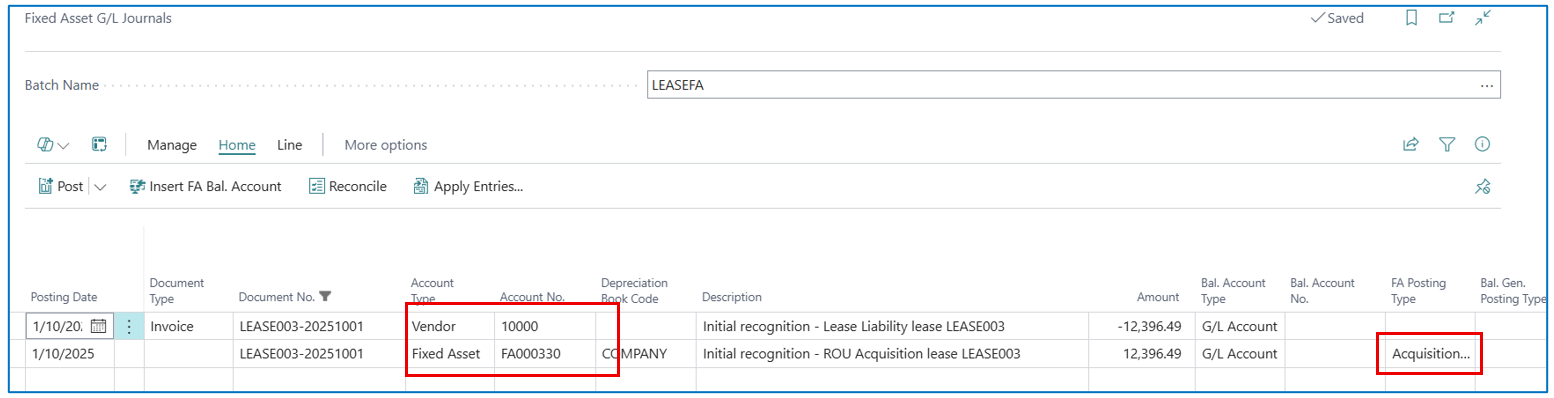 The initial entries for lease recognition will then be created in a Fixed Asset G/L Journal to add book value to the asset through “acquisition”.