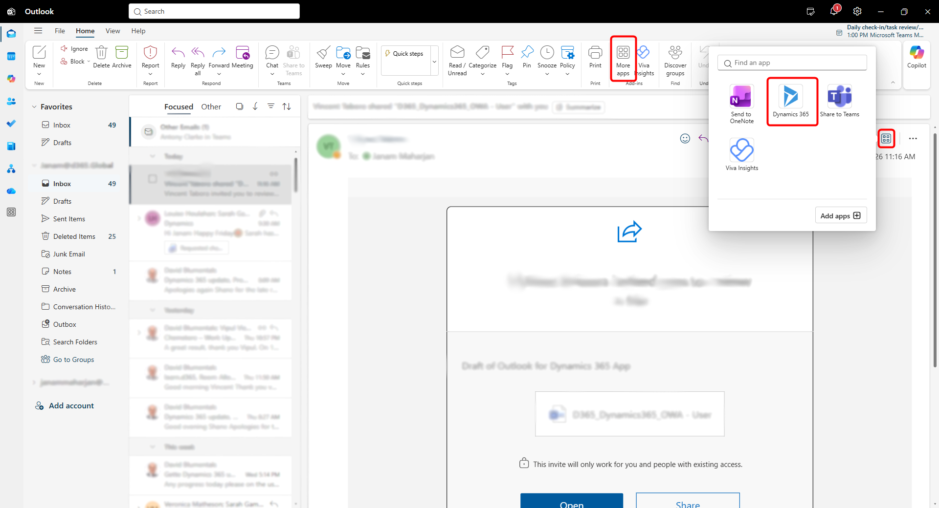Once installed, the app will appear in your Outlook interface (provided by your IT or system admin). The quickest way to access Outlook is from the Microsoft 365 suite of applications under Apps. You can access this on your web browser from Microsoft Teams (https://teams.cloud.microsoft/ ) after you sign in to your Dynamics 365 account.