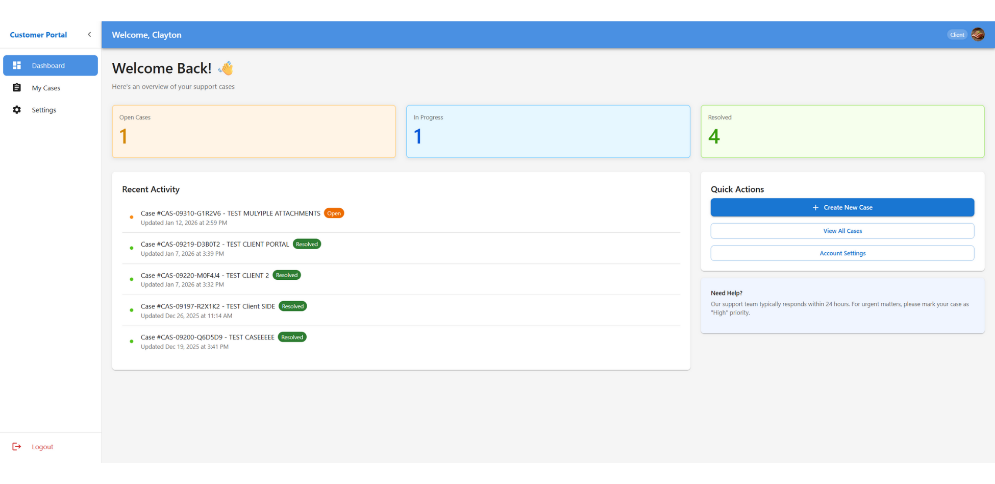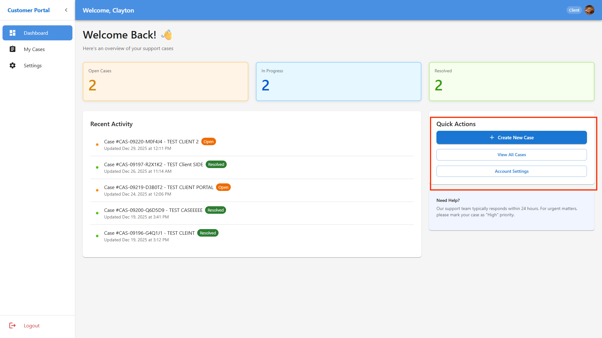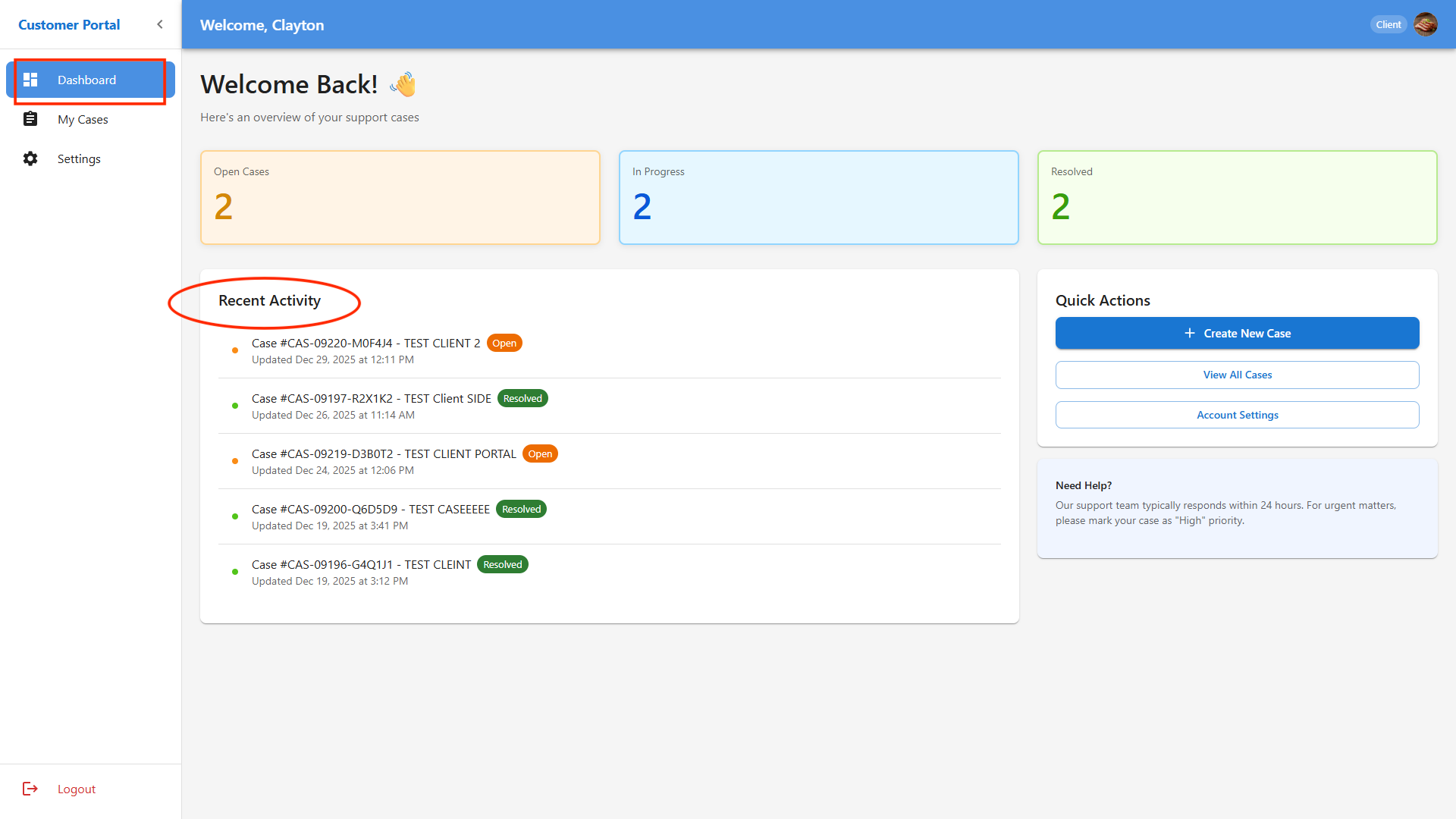 Overview of your cases and recent activity. You can use the dashboard to see an overview of your support cases, grouped by status: Open, In Progress, and Resolved. Check the Recent Activity panel for the latest updates on your cases. You can also quickly access common actions from the Quick Actions button.