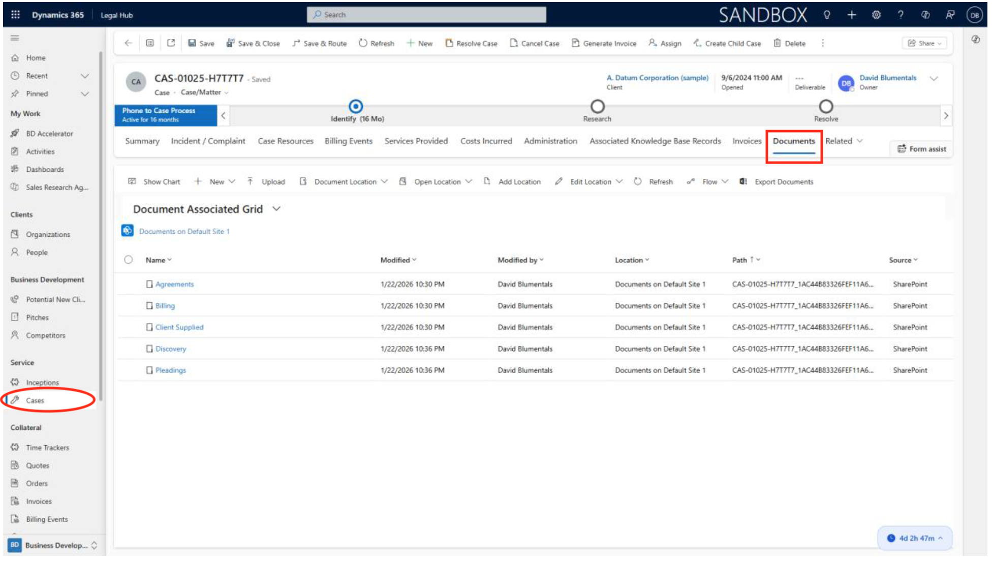 Dynamics 365 automatically creates a dedicated SharePoint folder for each new case. Access this via the Documents tab in the case record. Here you can: