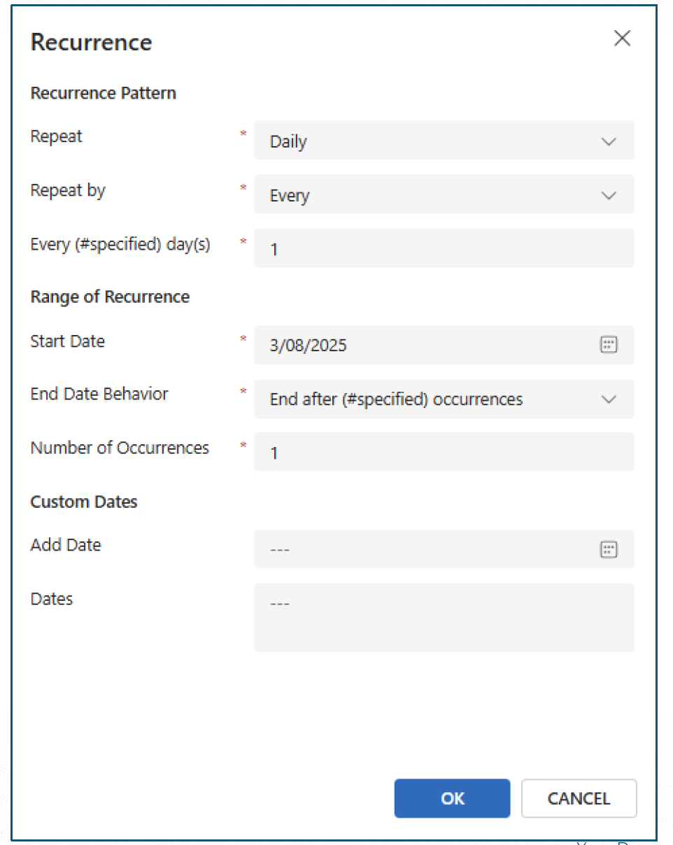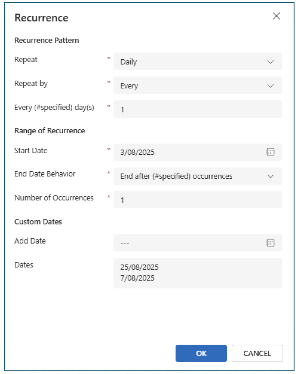 End Date Behavior — End After Specified Occurrence.