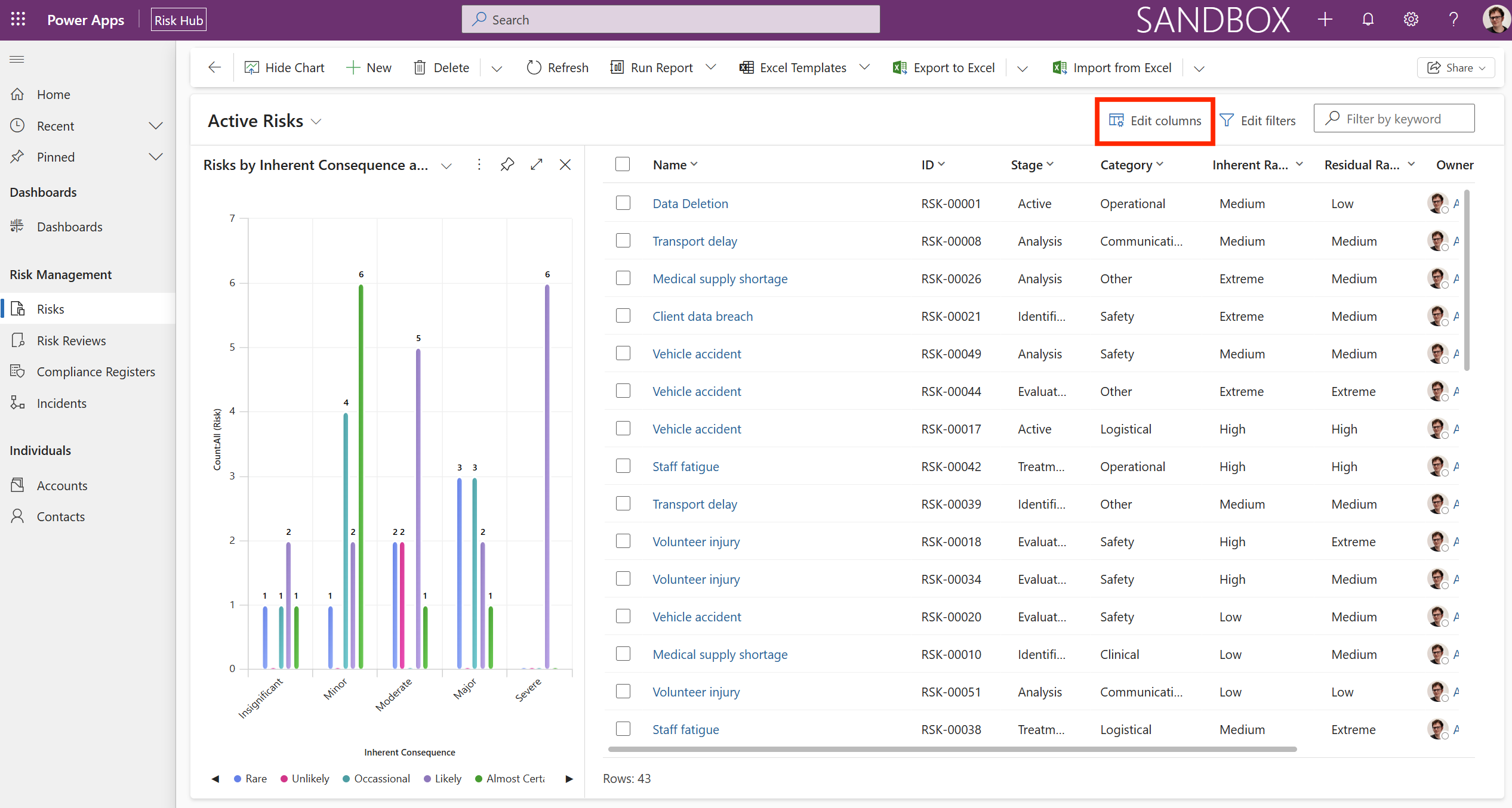 Click Edit Columns to add, remove, or rearrange the columns shown---common fields include risk ID, owner, category, rating, and status.