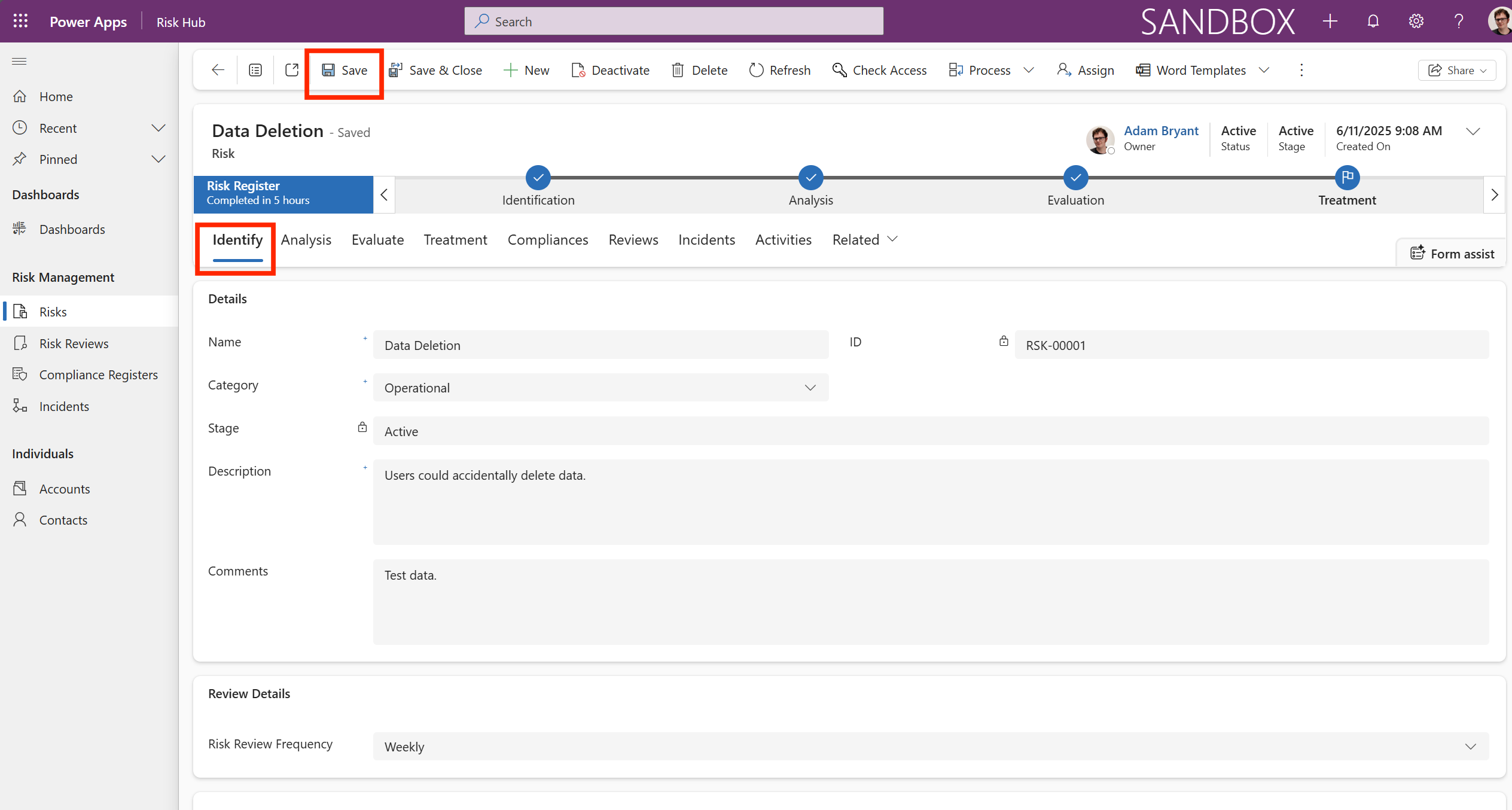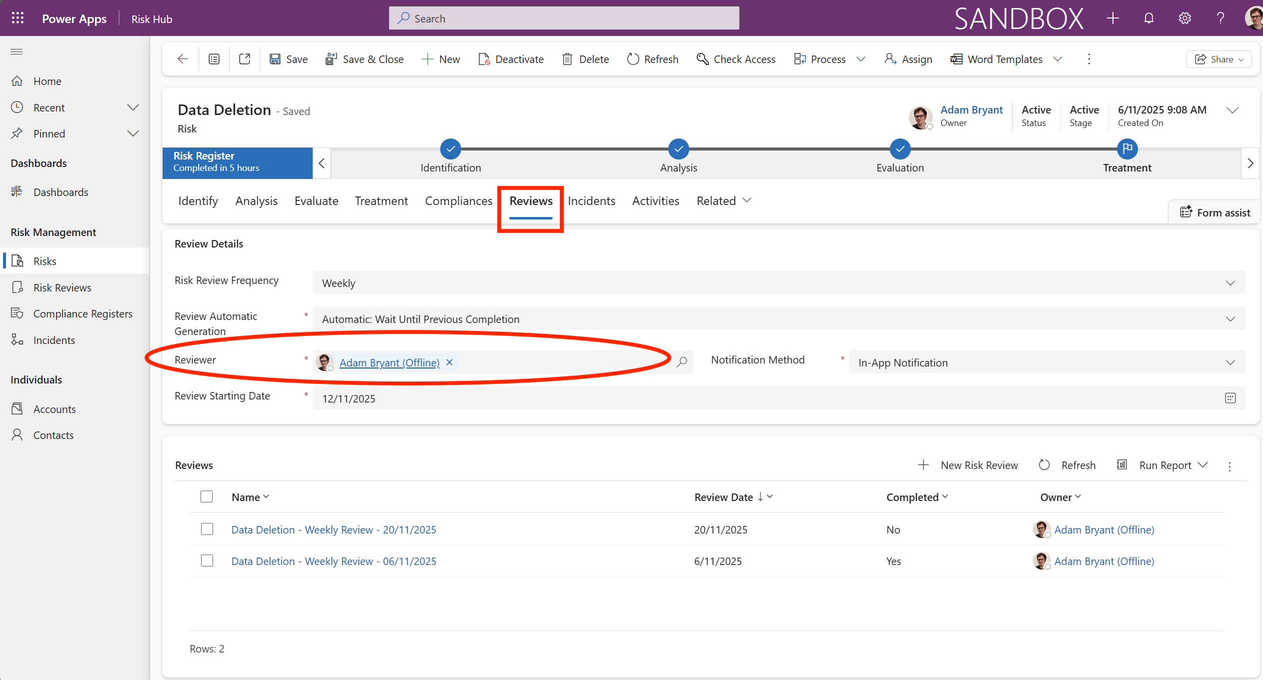 This confirms that the Data Deletion risk has successfully been treated from a Medium Inherent Risk to a Low Residual Risk and is now entering the continuous monitoring phase, with its first scheduled weekly review due on 20/11/2025. The purpose of this screen is to formally check if the controls put in place are working and if the Low rating is still valid.