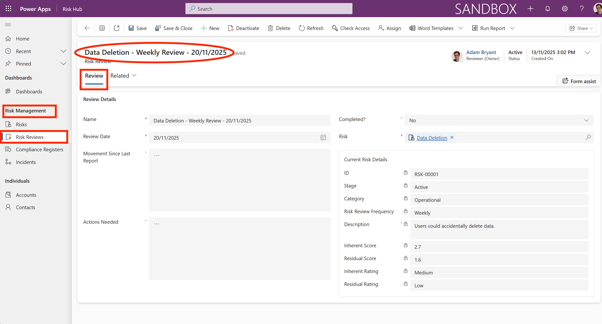 From the image example provided, it shows a record that can be viewed from Risk Management -> Risk Reviews from the main menu. You will see the Review tab, which details the planned “Data Deletion - Weekly Review - 20/11/2025” (ID: RSK-00001). The screen is focused on the Risk Reviews section of the navigation panel, indicating that the formal monitoring process is in use.