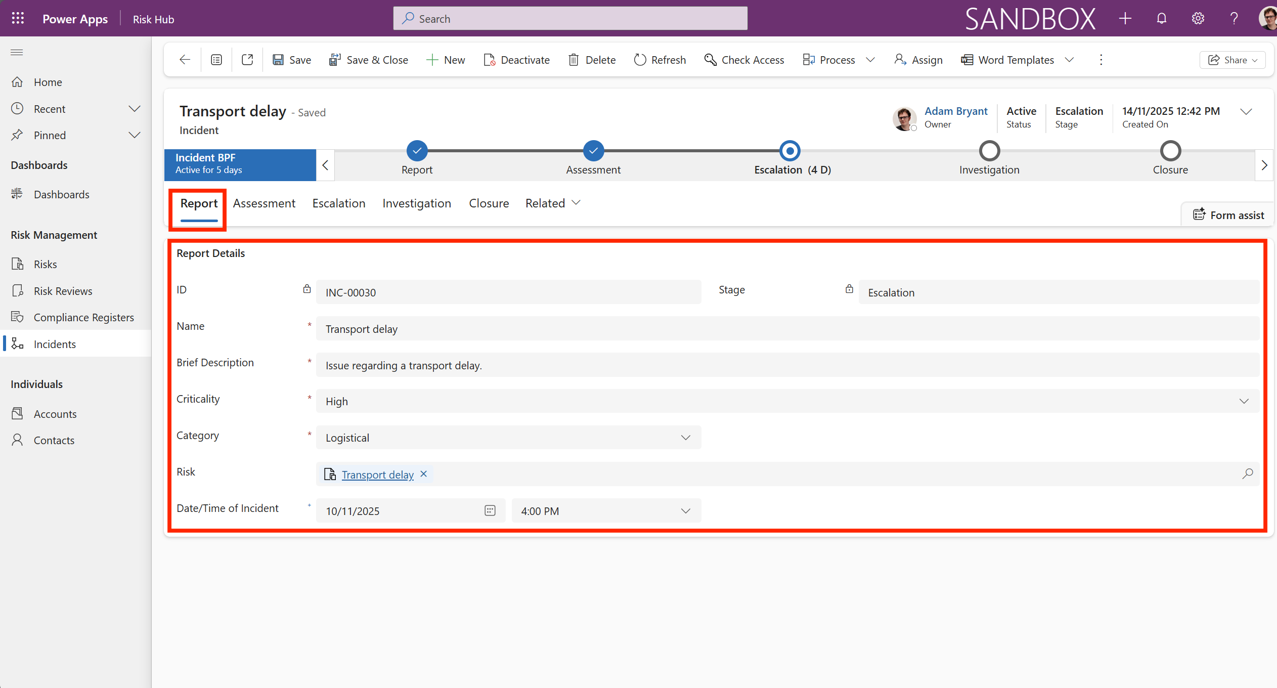The Report tab is where the initial details of a realized risk event are formally logged and documented. It provides the initial logging and classification of a risk event that has happened.