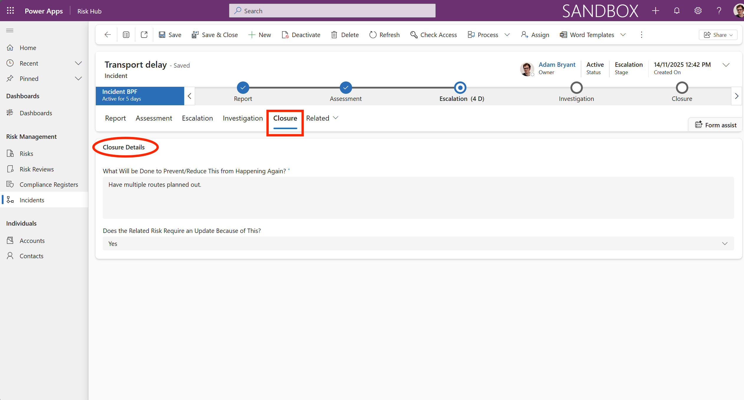 The Closure tab represents the final, formal stage of the risk’s lifecycle with information stored in the Closure Details. It is where the organization officially documents the decision to remove the risk from the active register.