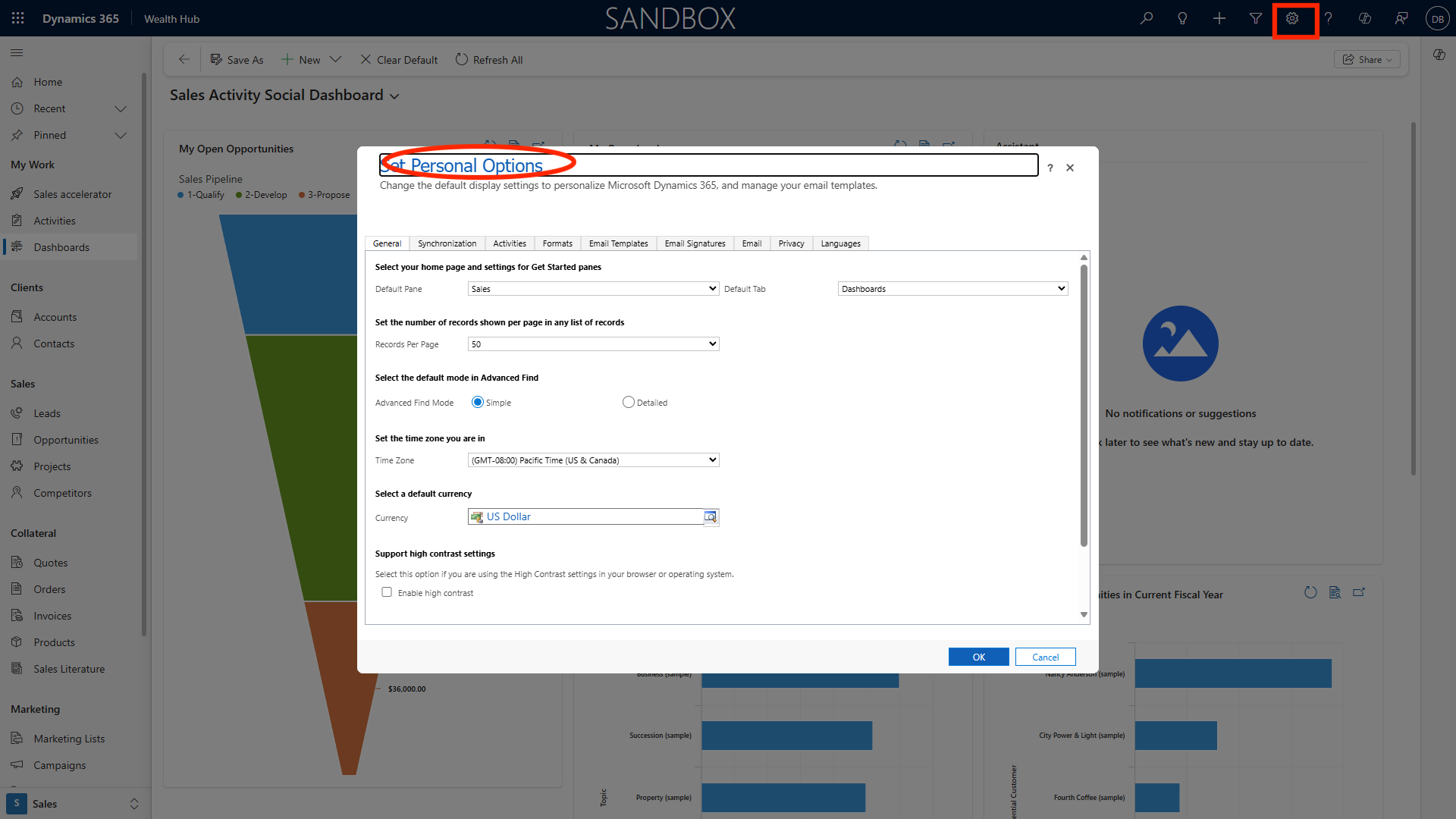 Choose your preferred dashboard, list view, or entity as your default Home Page. For instance, wealth managers may set their High Net Worth Pipeline dashboard as default.