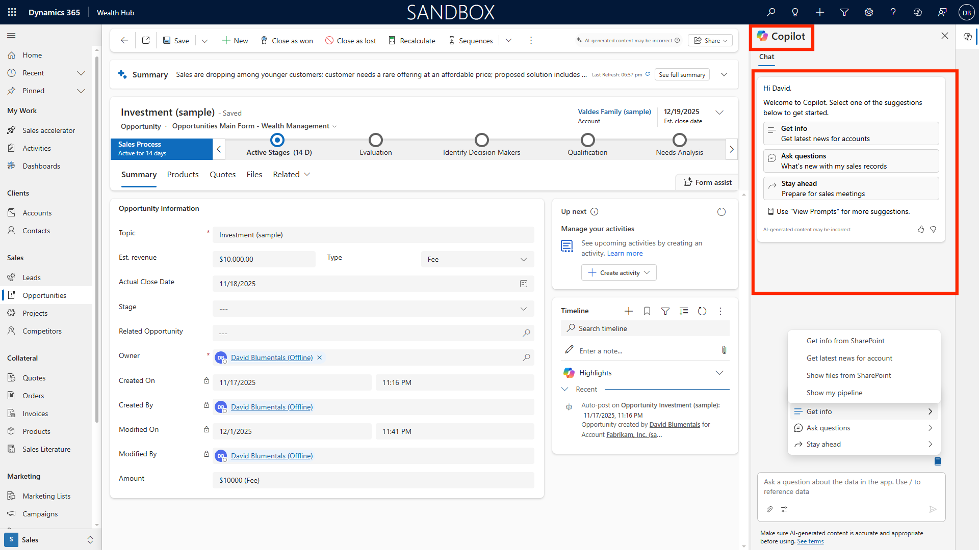 Engage with Copilot for summarizing opportunity details, surfacing news, or capturing meeting notes. For example, ask Copilot: “Summarize major client news impacting this deal.”