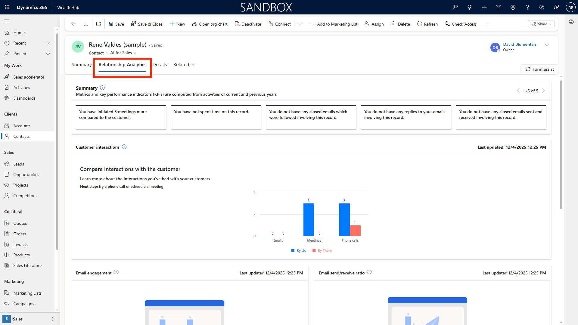 Within a contact record, access Relationship Analytics to view engagement metrics---such as email frequency, meeting cadence, and sentiment analysis.